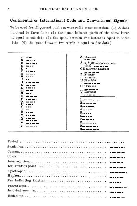 Question: I noticed in The Telegraph Instructor by G. M. Dodge (7th edition, 1921) the table for the Continental or International Code gives strange codes for some of the punctuation marks. For example, the code given for the period ( · · · · · · ) is neither American Morse nor standard International Morse/Continental Code. What’s going on here?