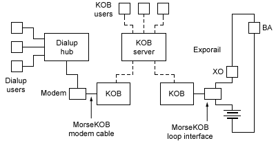 With the equipment described above, you can enable a single dialup Morse user to access the MorseKOB network whenever you like. Technically, moreover, nothing prevents you from using your modem to call one of the dialup hubs, which then connects all the users of that hub to the MorseKOB wire. If this is done in an unplanned manner, however, disruption to the system is possible and other users could be impacted.