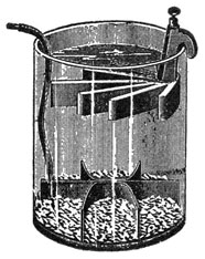 Anyway, you put the copper electrode in the bottom of the jar, and cover it with a layer of copper sulphate crystals (the bluestone) a half inch or a little more deep, fill the jar with water and hang the zinc in it so it is an inch or so below the surface of the water.
