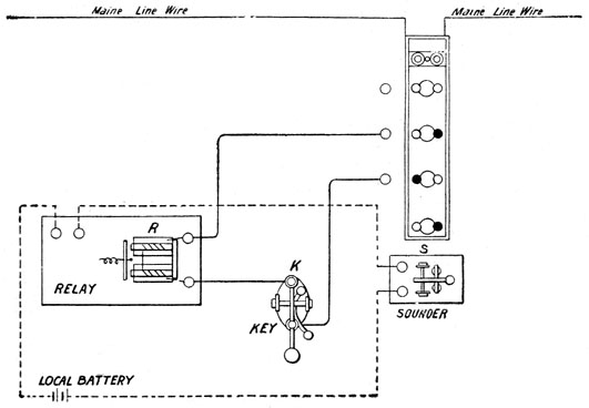 Each telegraph office on the same line was equipped with a switchboard, a key, a main line Morse relay, a local sounder, and a local battery. The main line wire came into the switchboard from each direction, and was then connected to the instruments on the operator's table. This put the relay magnets and the key in series with the line circuit. The contacts on the relay were connected in series with the local sounder and the local battery, which normally consisted of two crowfoot cells in series.